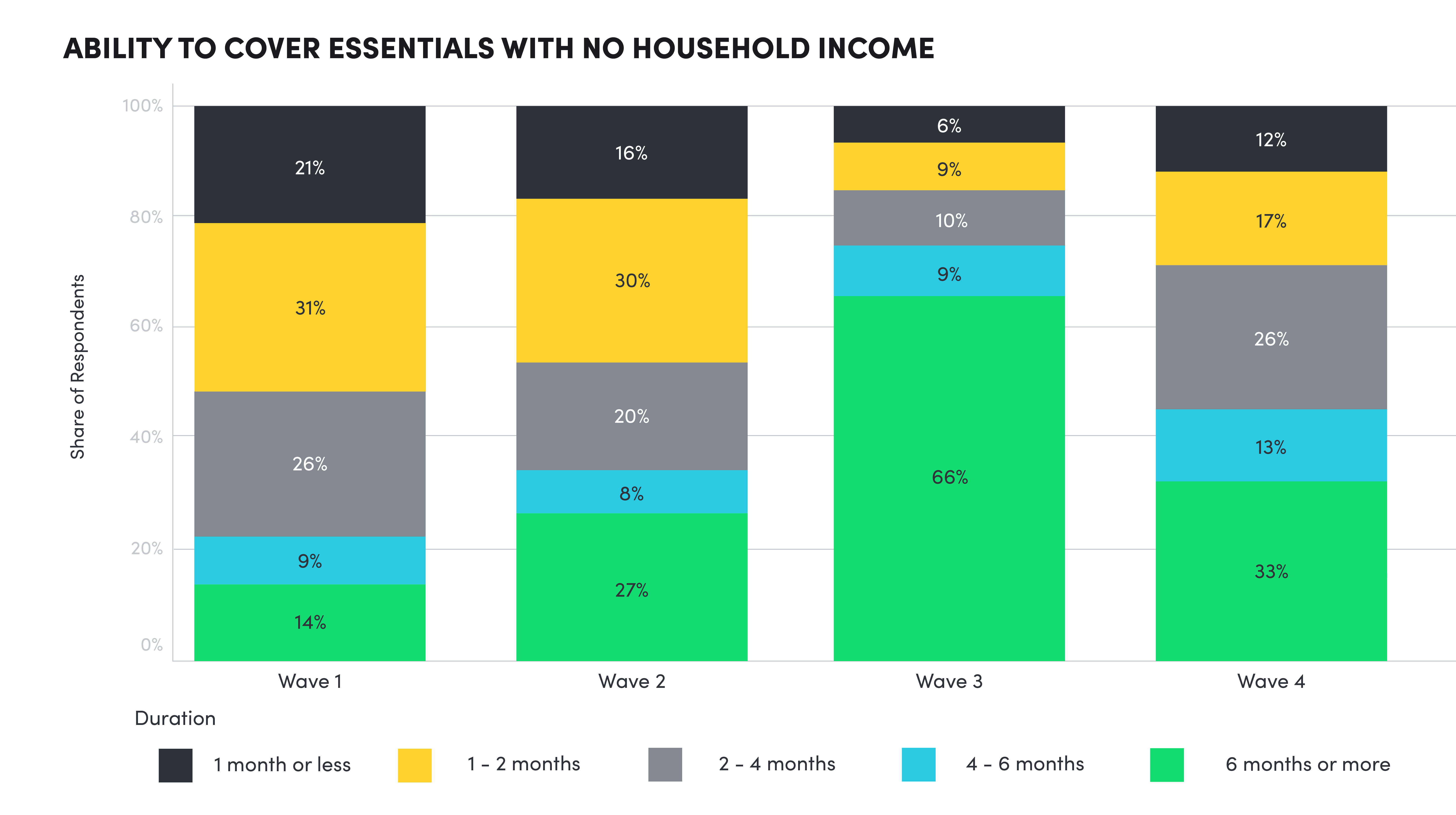 In India, 89 percent of MSME owners reported a decrease in profits in wave 1 and, although many saw an increase in profits in waves 2 and 3, profits significantly dropped again in wave 4 during June 2021 when India reported a heavy rise in COVID-19 cases. These profit trends are similarly reflected in the MSME’s ability to cover essentials over the longer-term, showing that as profits decrease due to COVID-19, financial security drops significantly.