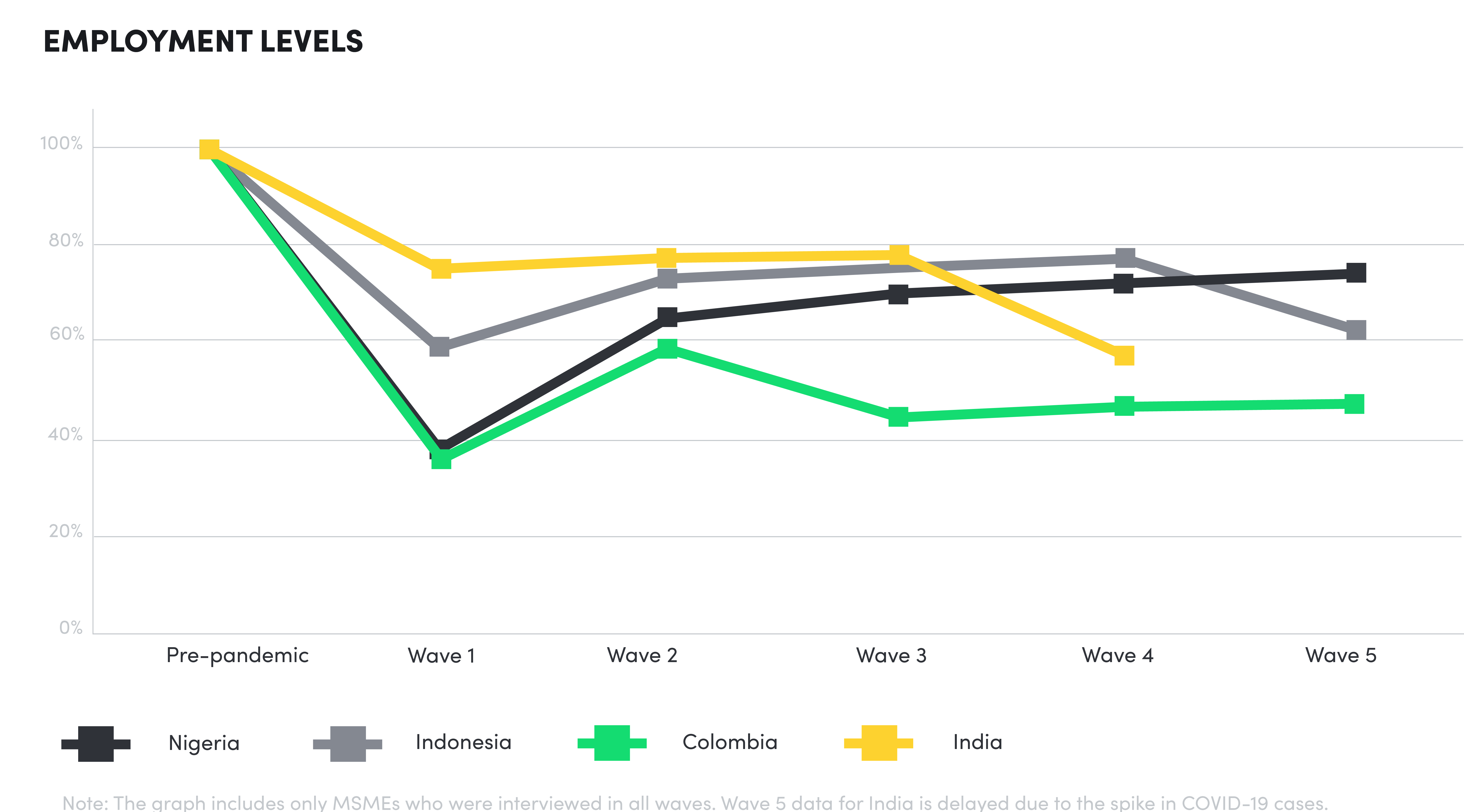 MSMEs are also struggling to return to pre-pandemic levels of employment. These businesses, which are a key employer of low-income and vulnerable workers, have reduced their workforce during the pandemic to cut costs. Now more than a year into the onset of COVID-19, the MSMEs surveyed in all four markets studied still have not returned to pre-pandemic employment levels. Based on the latest wave of data, the MSMEs surveyed in Colombia are operating with 48 percent of their pre-pandemic workforce, India with 58 percent, Indonesia with 63 percent, and Nigeria with 74 percent, indicating that employment continues to be fragile and MSMEs use workforce reduction as an early cost-cutting measure in times of financial instability.