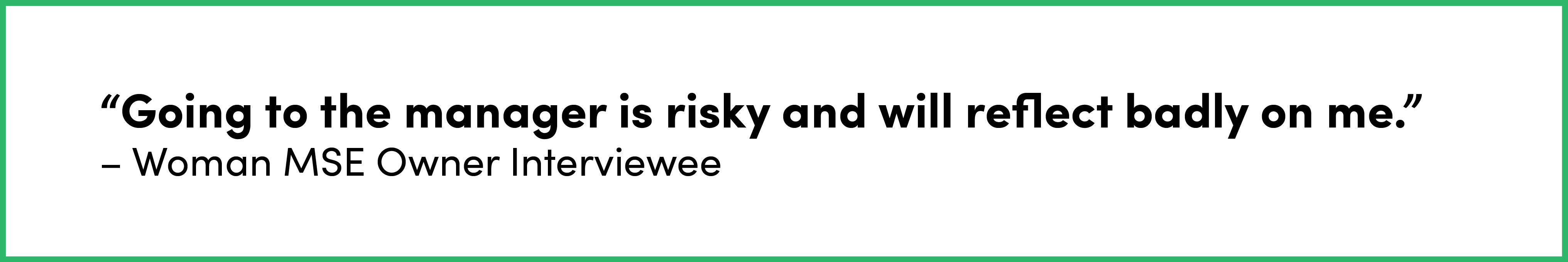 Akanksha’s experience highlights some of the barriers to complaints resolution and consumer protection for women MSE owners in India, driven by low confidence in DFS and a reliance on personal relationships with distributors and staff. In an interview with one fintech CEO – whose company was also among the Inclusive Fintech 50 winners – she said, “Women do not come screaming and shouting; this never happens. Local partners are more approachable. It is a business relationship; if you go to that level, it is also a social relationship.”