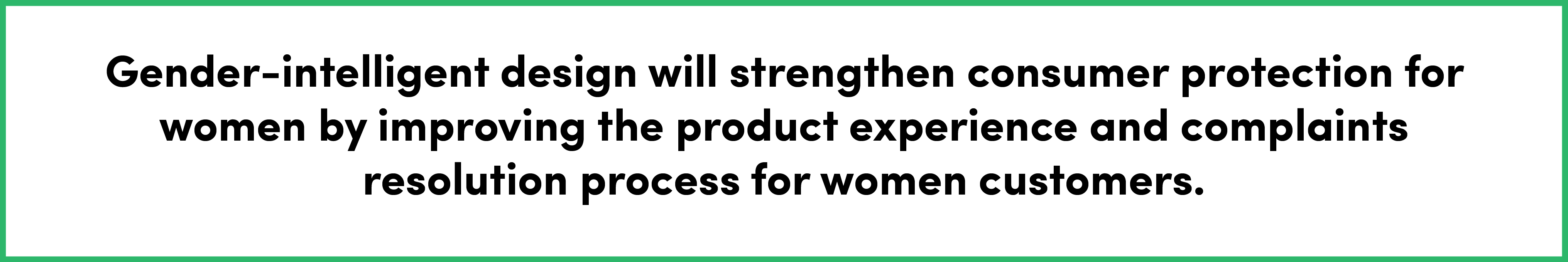 The interviews with women users in India showed that they highly value personal relationships and prefer in-person complaint resolution. However, women face higher challenges to complaint redressal because of their strong preference for resolving issues through social interactions and providers’ lack of gender-sensitive consumer protection policies. As such, to accommodate women’s user preferences, banks and fintechs need to adopt gender-intelligent strategies.