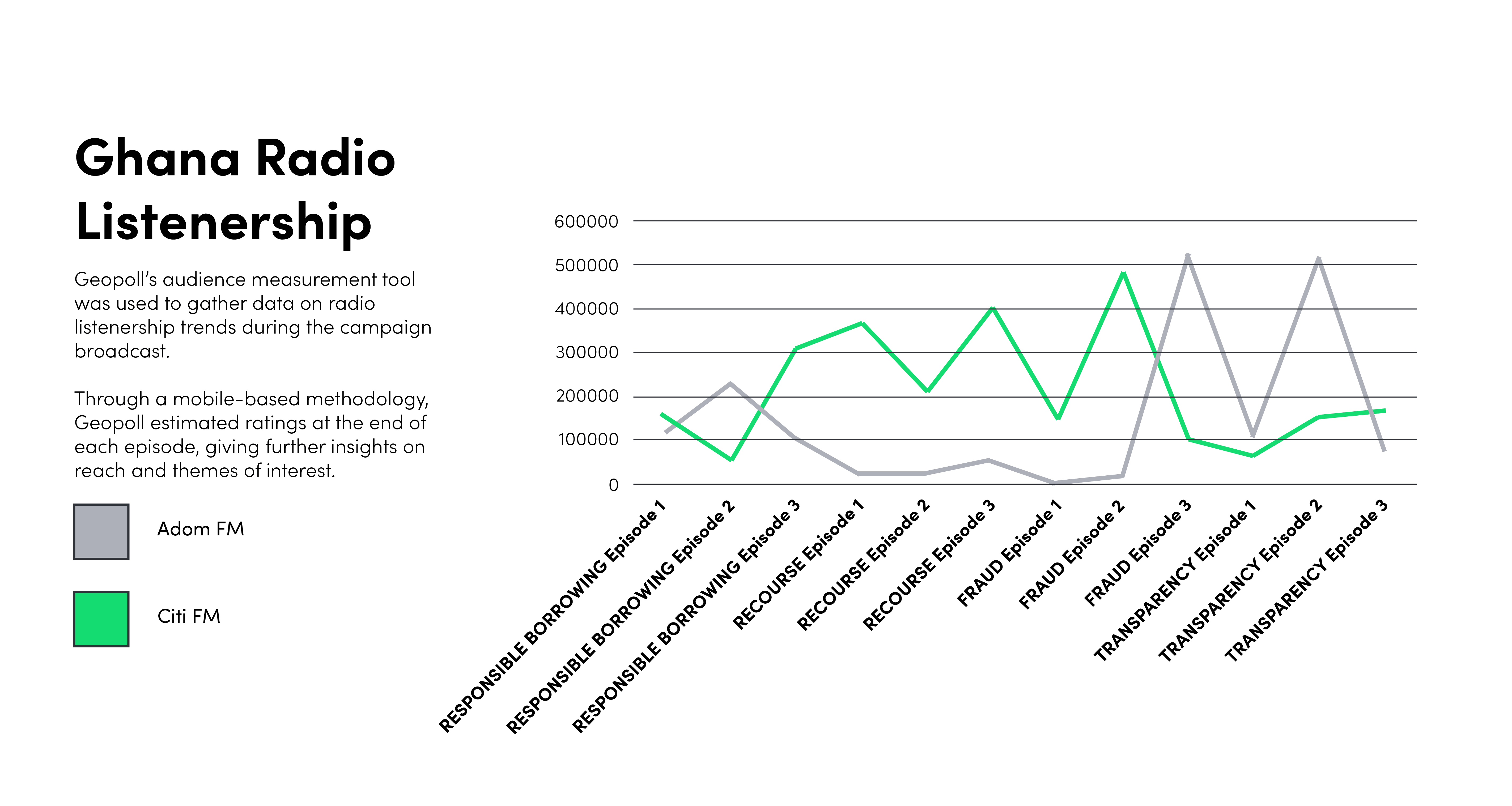 With an average listenership of 218,250 people per episode during the span of the campaign, responsible borrowing, recourse and fraud were the most popular episodes on Citi FM. Adom FM generated an average listenership of 151,083 people per episode, with fraud and transparency as the most popular.