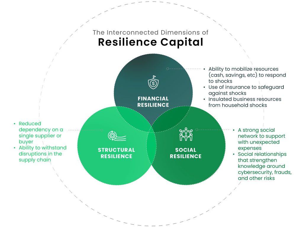 While resilience is now widely understood as multidimensional, the systems meant to support it remain fragmented. A broadly accepted definition of resilience emphasizes the capacity of households and firms to anticipate, withstand, and recover from shocks while sustaining progress over time. The defining element in this formulation is the presence of shocks, which can originate from many sources, including climate events, health emergencies, digital and cyber threats, income disruptions, and failures in physical or social infrastructure.