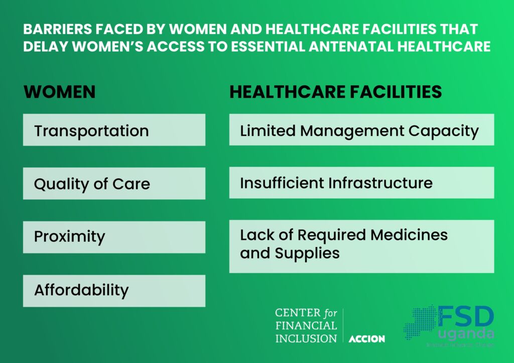Research by FSD Uganda and other experts have found that the high maternal mortality rates in Uganda are primarily related to pregnant women’s lack of or delayed access to maternal3 healthcare (Morgan 2017 et al.). The barriers to accessing care — particularly severe for rural women — includes transportation, quality of care, proximity, and affordability (FSD Uganda). Additionally, both public and private healthcare facilities suffer from limited management capacity, insufficient infrastructure, and inadequate medicines and supplies. These deficiencies not only deter women from seeking antenatal care but increase the financial burden of those who do.