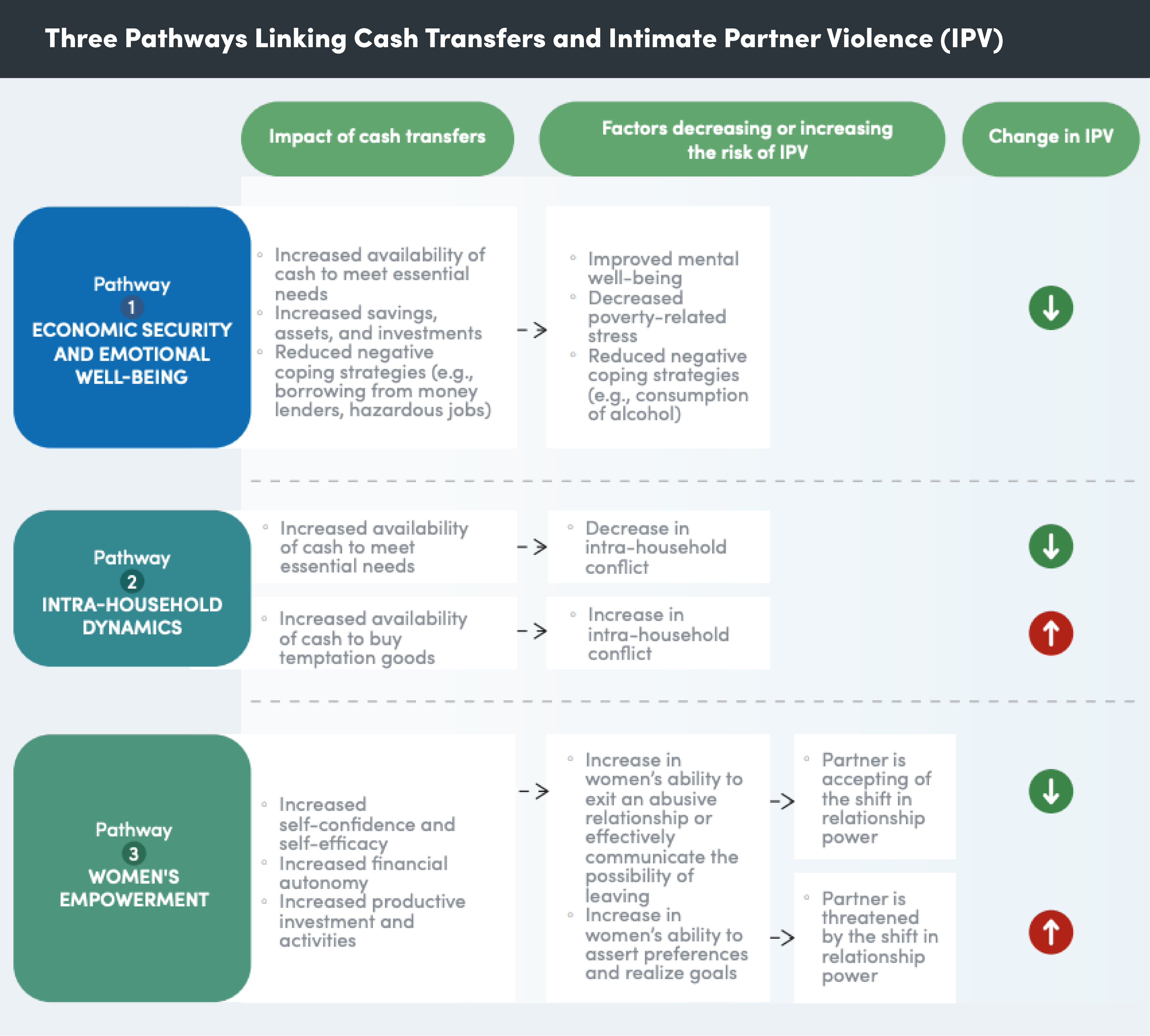 There are three pathways through which cash transfers can either reduce or exacerbate the risk factors associated with IPV. In one pathway, cash increases household income, thereby reducing conflict due to economic insecurity and related emotional stress. In these cases, cash transfer programs have proven to positively impact household economic security, leading to reduced reliance on negative financial coping mechanisms, enhanced emotional well-being, and reduced IPV.