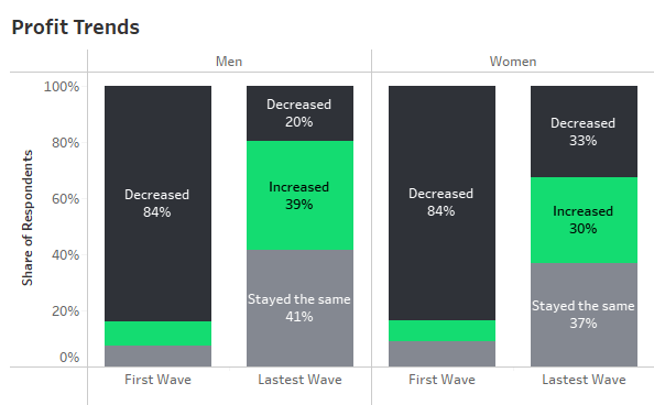 In the first wave of surveys CFI conducted in the early months of the pandemic, 18 percent of women reported having closed their businesses, 6 percentage points higher than men. While both men and women respondents reported a decline in business profits and an inability to cover business expenses using revenue at similar rates in wave 1, in the latest survey conducted a year after the first wave, women reported declining profits and inability to cover expenses at a higher rate than men, highlighting the uneven nature of the recovery (see “Profit Trends” table).