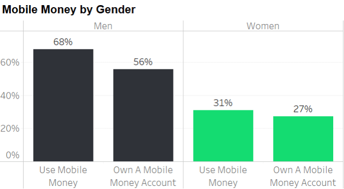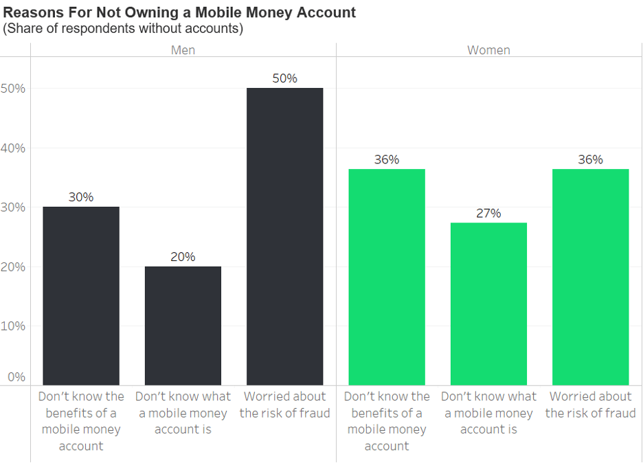 But our data also shows that women are less likely to conduct financial transactions via a mobile phone, use mobile money, or own a mobile money account (see “Mobile Money by Gender”). Women are also less likely to know the benefits of mobile money or to know what a mobile money account is (see “Reasons for Not Owning a Mobile Money Account”).