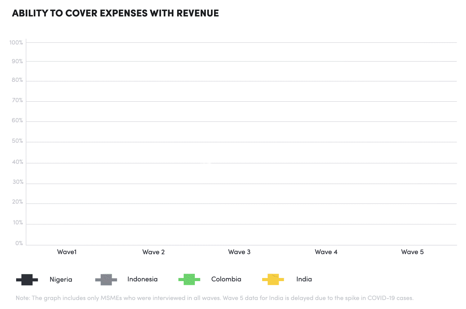 Figure 3. MSMEs are struggling to cover expenses with revenue, and the spike in COVID-19 cases in India between waves 3 and 4 resulted in a drastic decline in their ability to cover expenses with revenue.