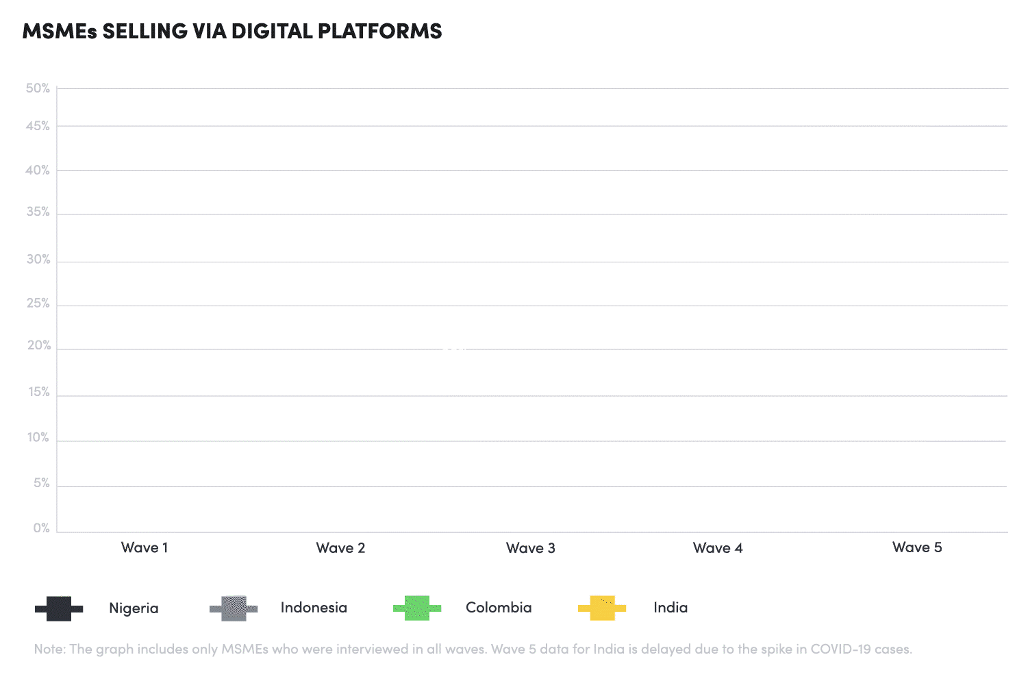 Colombia was the only market showing a significant overall share and increase in the number of MSMEs selling on digital platforms. This is attributed to the comparatively robust digital product offerings of our Colombian partner financial institution, a fintech with a higher baseline of digital adoption among its clients. India’s results show the fragility of the country’s situation due to the pandemic, as wave 3 surveys were run February to March 2021, and wave 4 was from June to July 2021, two periods when the country experienced some of its largest impacts from COVID-19.