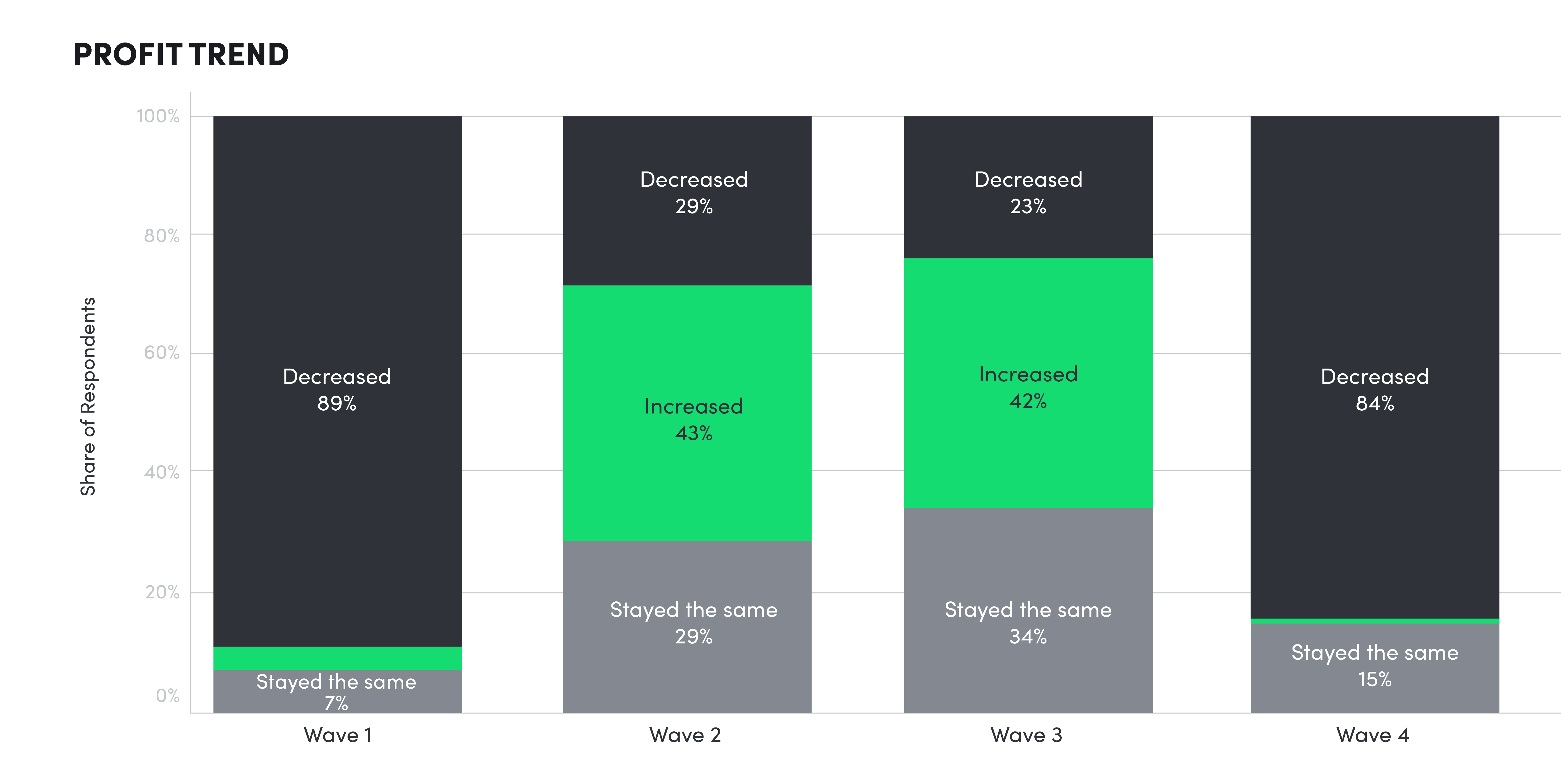 Early in the pandemic, lockdowns and restrictions on physical movement led to significant income declines and business closures; although 74 percent of survey participants had steady or increasing profit levels pre-pandemic, that number dropped to just 16 percent by wave 1. Declining profits were largely attributed to government lockdowns and restrictions on movement in the first half of 2020, which led to 15 percent of MSMEs in our wave 1 sample to shut down. While data from subsequent waves shows that many businesses began to recover by the second wave, continued restrictions and uncertainty due to the ongoing pandemic proved those recoveries to be temporary and unstable, with surviving businesses reporting declining profits in later waves.
