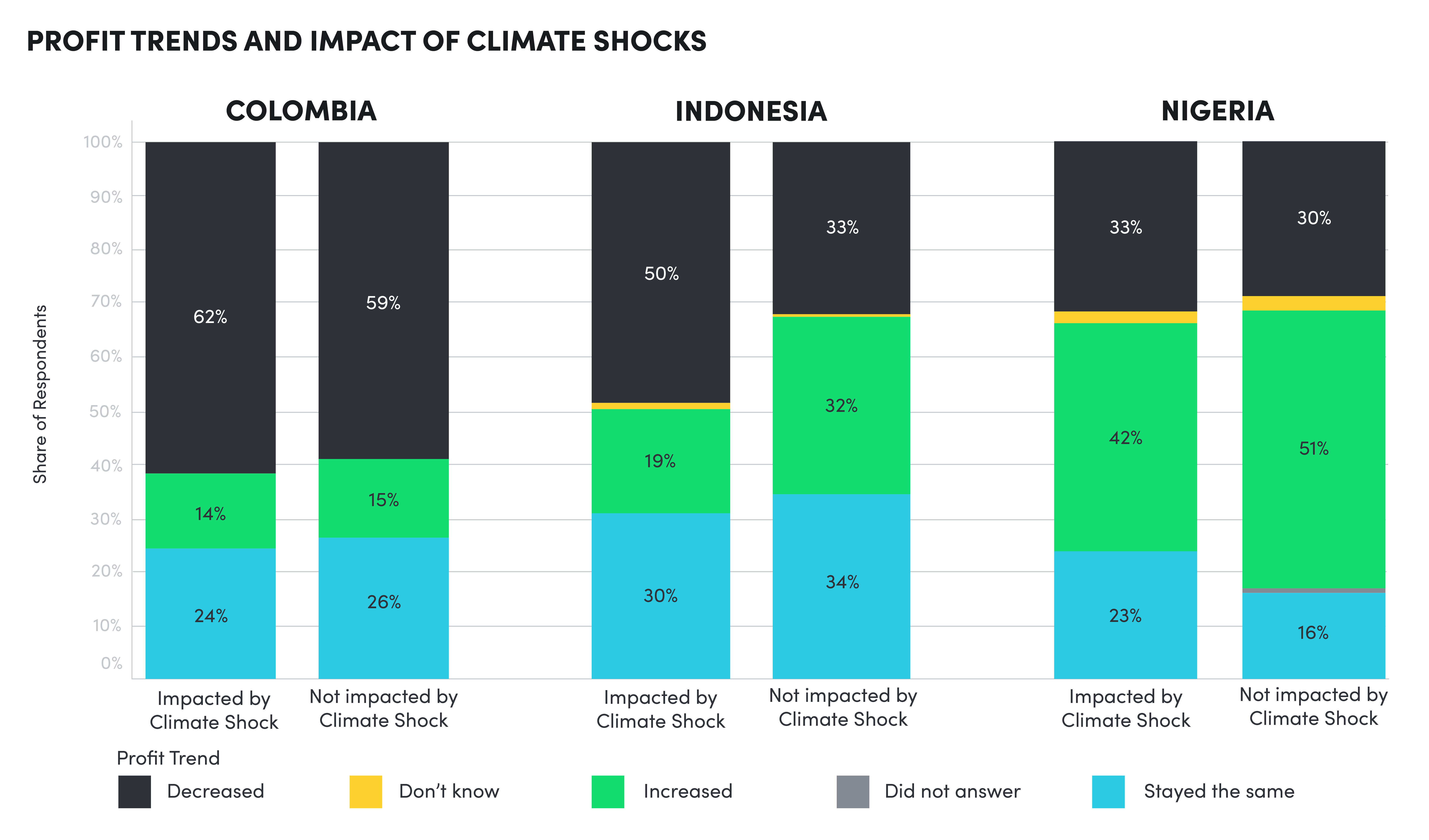 CFI’s data shows that MSMEs that have experienced previous shocks or crises, such as climate shocks, are having a more challenging time recovering from the financial effects of the pandemic. For instance, in Colombia, Indonesia, and Nigeria, MSMEs that were impacted by a climate shock (e.g., flooding, droughts, heatwaves, etc.) were more likely to report declining profit trends in the wake of COVID-19.