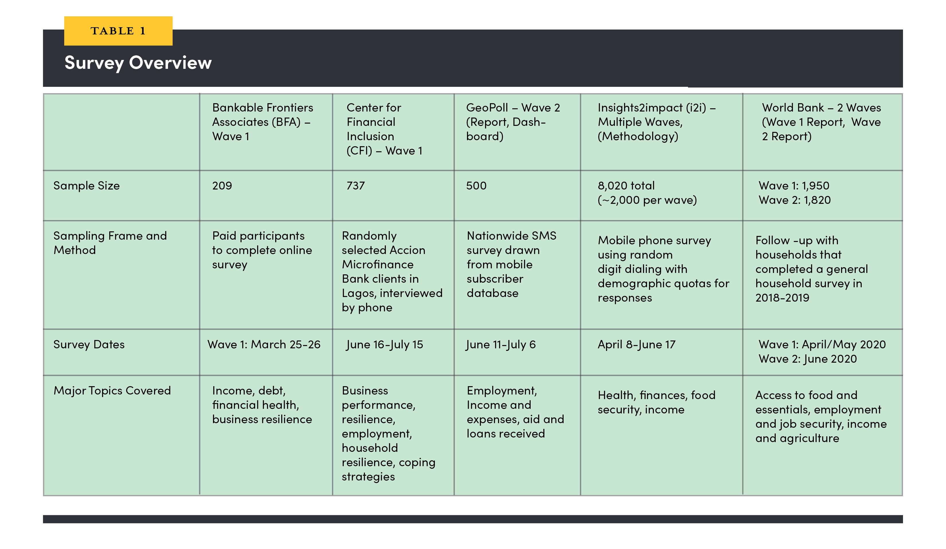 CFI looked at five surveys that have been conducted since COVID-19 reached Nigeria. A summary of those surveys—including sample size, notes on sampling method, survey dates, and major topics covered—is available in Table 1.