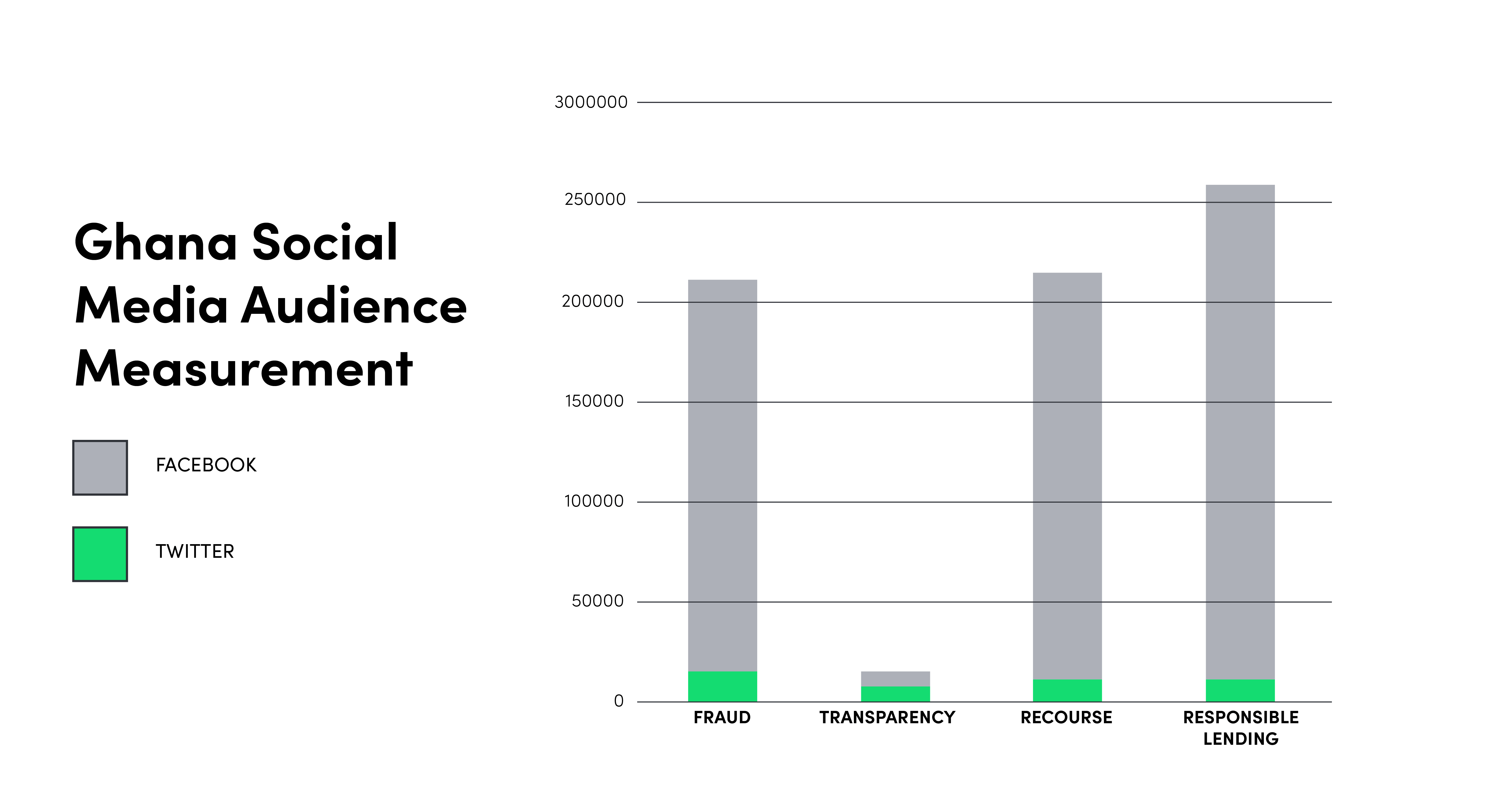 The Ghana radio campaign’s aim was to reach as many clients as possible. As such, the campaign relied heavily on Facebook and Twitter, as well as SMS dissemination to reach a wide audience.